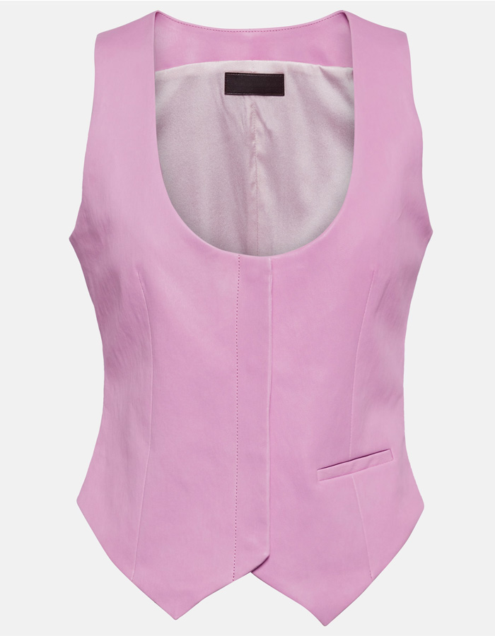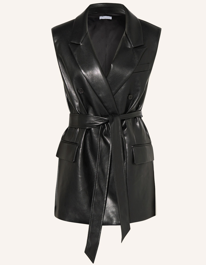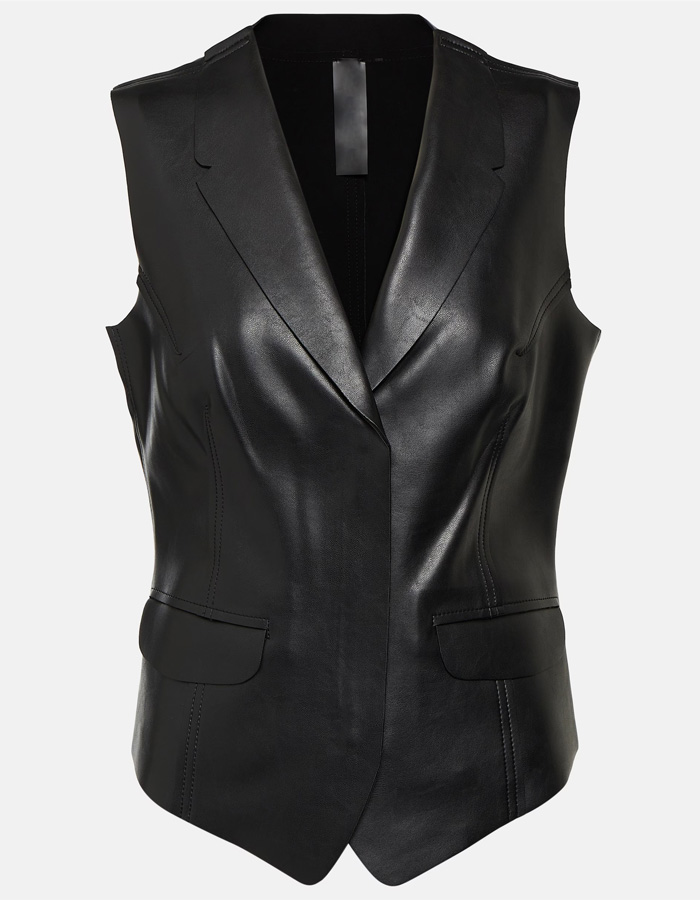 Leather vest Material II: 90% polyester, 10% elastane Material: 100% polyurethane Designer color name: Black Closure: concealed zipper Pockets: flap pockets Care instructions: machine wash cold