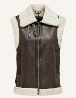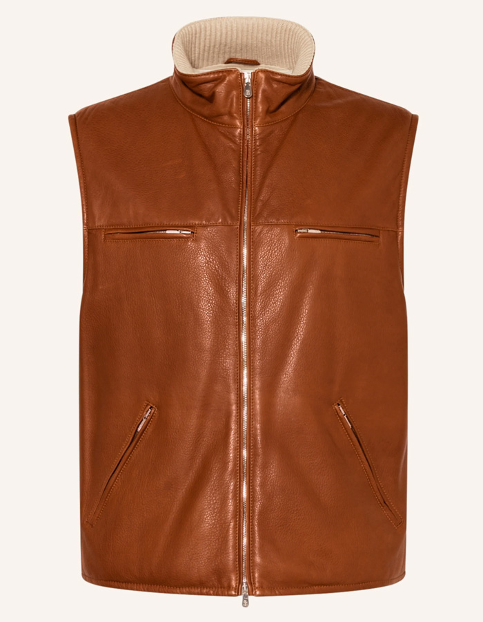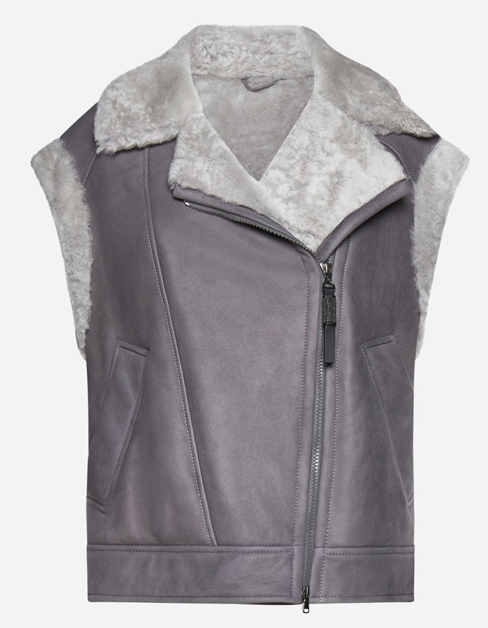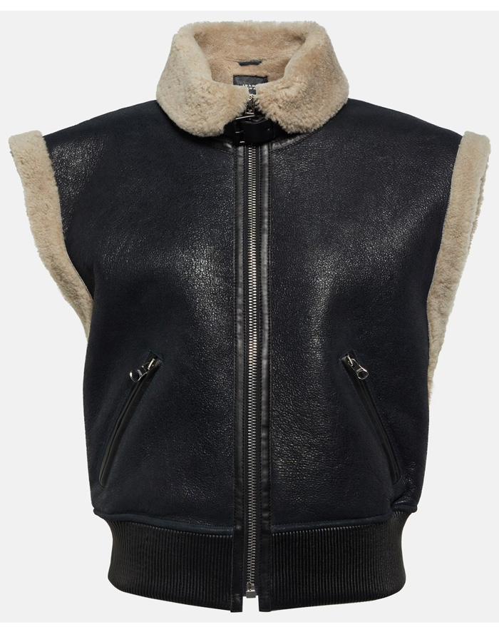 Leather and shearling vest Material: 100% lamb leather Pockets: zipped pockets Contains non-textile parts of animal origin Comes with garment bag