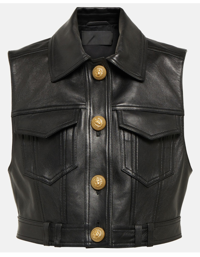 Cropped leather vest Closure: button fastening Belt loops Designer color name: Noir Lining: fully lined, 52% viscose, 48% cotton Material: 100% lamb leather Pockets: breast pockets Care instructions: do not clean