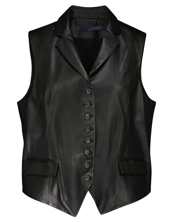 Leather vest Lining: 100% silk, fully lined Material: 100% lamb leather Designer color name: Black Pockets: flap pockets Closure: buttoned front Care instructions: dry clean Back waist tab